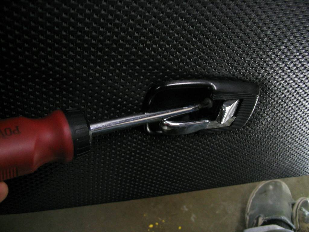 Screw the door latch release cam back on. If the spring came out, place it back inside the cam and place the spring ears on the