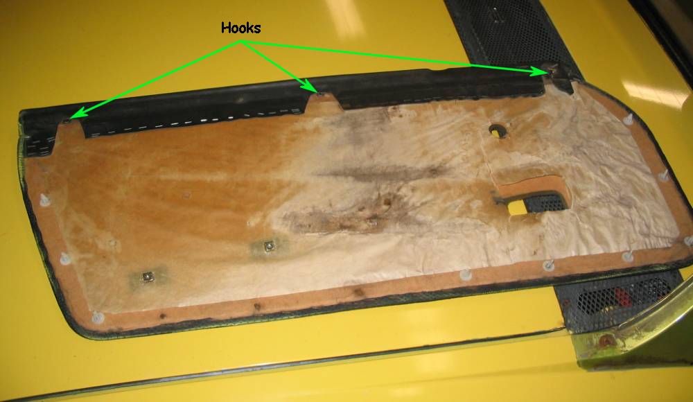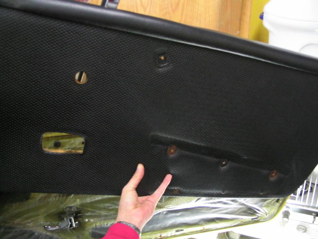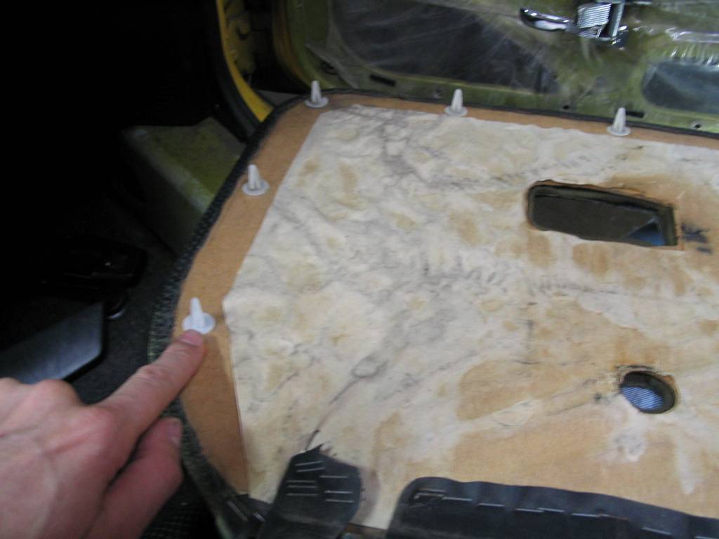 Here's the back side of the panel and I'm pointing to one of the plastic clips that hold the panel to the door: