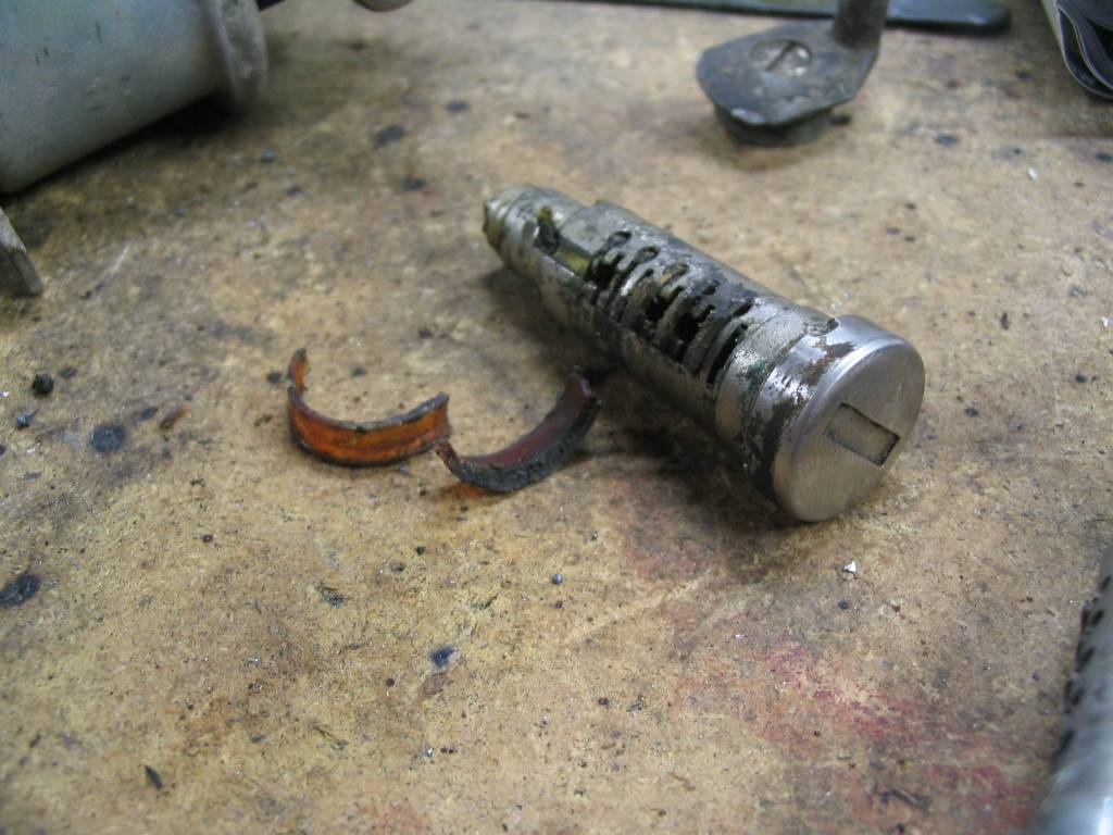 Notice the orangish, broken plastic pieces there? That was the seal on my replacement lock cylinder. My broken door handle