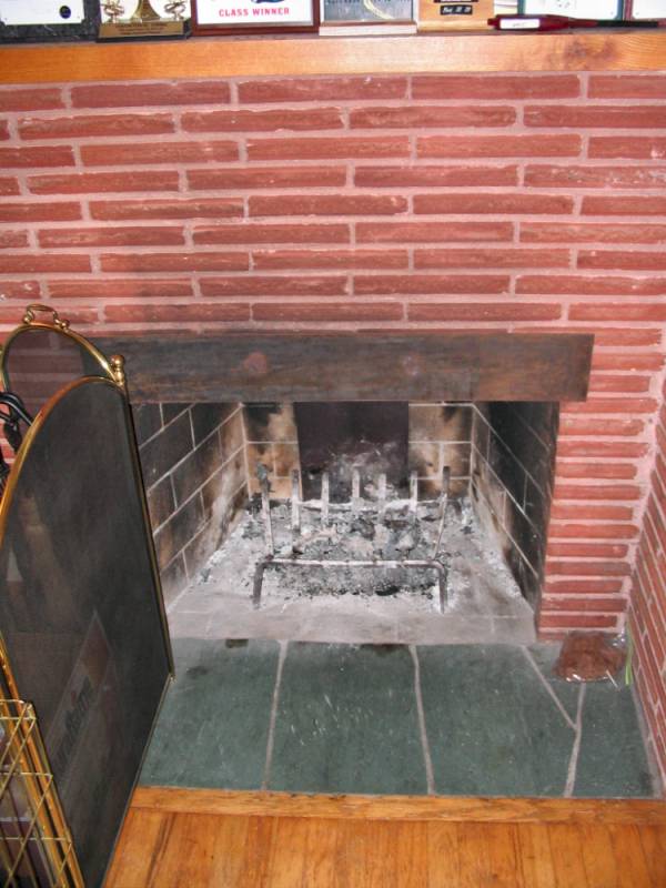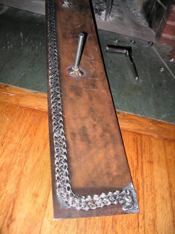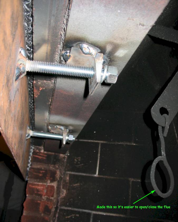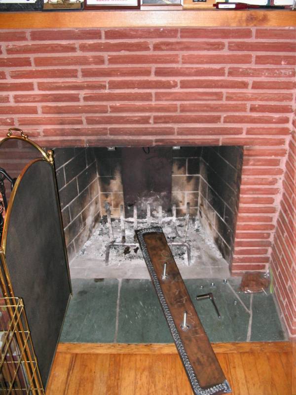 - Shorten fireplace opening. Some smoke was wafting out of the fireplace because (after doing some research) my fireplace opening was too large for the flue. The 'easiest' thing for me to do was reduce the size of the opening. 'Rule-of-thumb' calculations indicated a 6-inch reduction from the top...too much for my liking. After spending much time in a dark room with a flashlight, a 6-inch board wrapped in aluminum foil, and braving the fire I was able to establish that a 4-inch reduction in height would work. For extra measure I added a 1/2-inch. Here's what the back side looks like and here it is attached. Welded 1/2-inch bolts to the 12-gage sheet metal and welded angle iron with holes drilled to the steel lintle already there. The nuts are snugged (not heavily torqued!) and the beefy split washers are compressed enough to lock them. High-temp seal and gasket cement is used to glue the wood stove gasket to the plate (both easily found at a fireplace/stove store). It works PERFECTLY -- no more smoky smells, no more burping smoke detector! Don't ask me how to make one because every fireplace is different AND either you have the tools/skills/sense to do it yourself or you don't (though I think it's fairly easy).