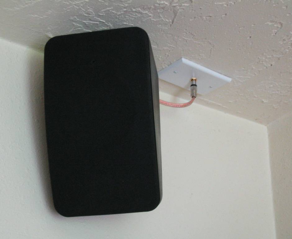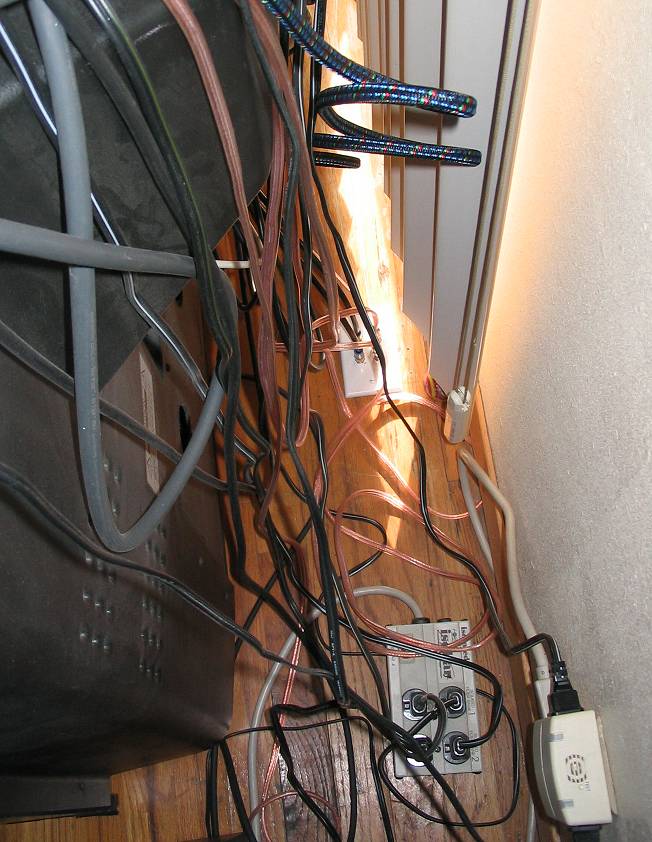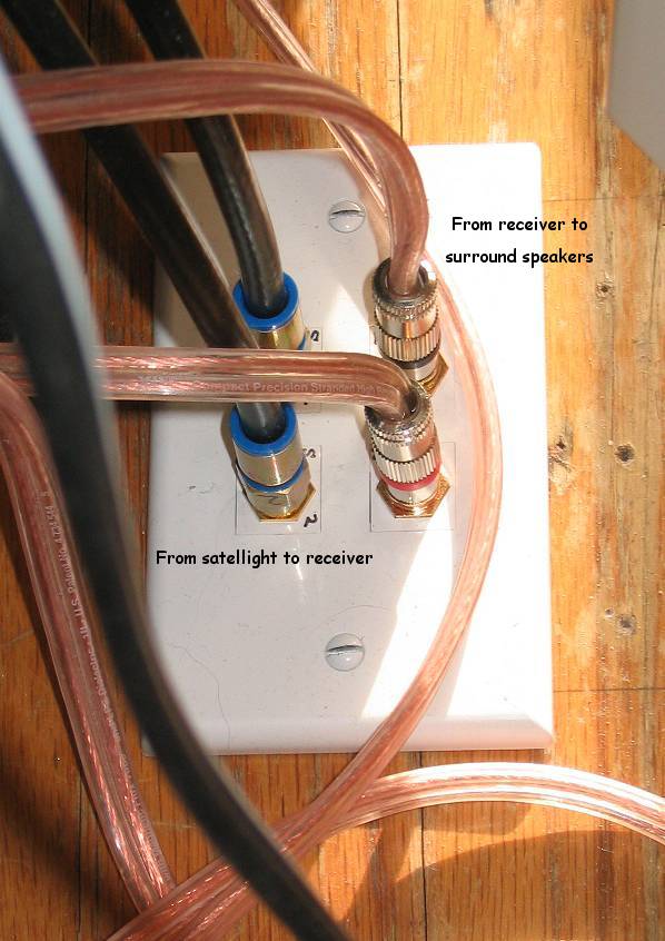 - Audio/Video: Satellite wiring (primary and secondary) run under house and terminated at floor plate (bought at Home Depot). Floor plate also has left (black) and right (red) surround speaker inputs. The wiring runs from the floor plate, under the house to the wall that divides the kitchen from the living room, up that wall and into the attic. Left and right wires are the same length (about 20' of extra wire for the right speaker). This cleans up the living room, leaving no exposed wires in the living room and places the speakers out of the way. 10-pound universal mounts used to hold Polk Audio speakers to ceiling.