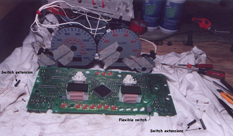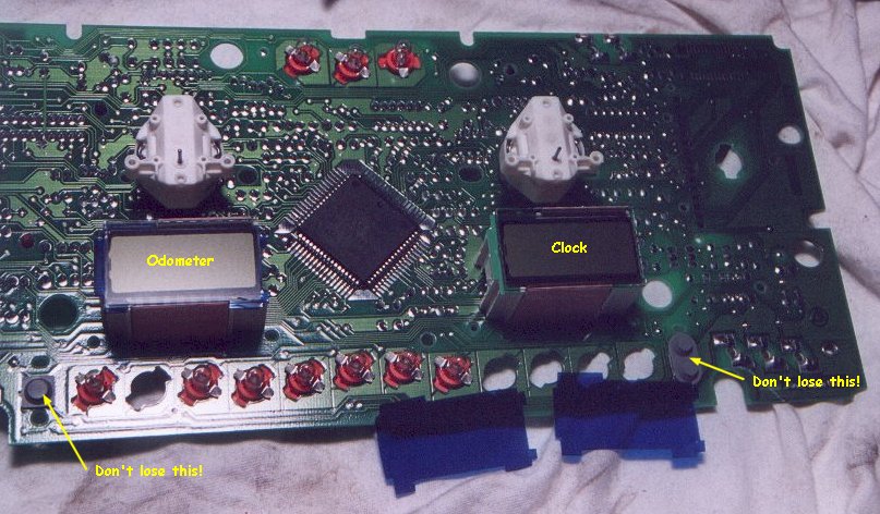 On the back side of the cluster, on the PC board, are eight brass-colored screws. These hold down the black plastic gauge body assembly. Remove the screws and carefully lift up the gauge body assembly -- if you haven't removed the gauge needles then you need to remove the needles before attempting this. You will be prying it up from the PC board. Be very careful not to lose the grey flexible pads that are used by the gauge buttons (odometer and clock switches). The LCDs are now exposed.