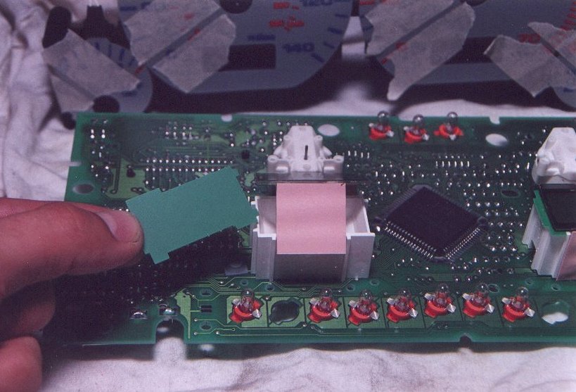 To remove the stock green filters you will lift up on the LCD face. Now, the LCD assemblies are loosely assembled and are likely to come apart. Just move carefully and if the flexible side conductors separate from the LCD and/or the PC board just make sure you assemble them in the correct orientation otherwise you make end up with a non-functional LCD. In the image below you can see that my odometer LCD and flexible conductor lifted up together and I was able to slip the green filter out (I called it a gel in the image, think of it as the same thing).