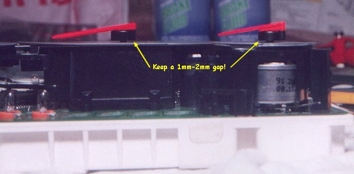 After changing both filters you can carefully put the gauge body assembly back on the PC board and screw it down snugly. Make sure the grey flexible switches and extensions are in place. If you LCD assemblies were loose they now will get properly positioned when you put the gauge body assembly in place. Press the needles back onto their spindles, positioning the needles between your previously made tape guides. You want a 1mm-2mm gap between the needle hub and gauge face so there is no contact between them. As I found out, any contact will not allow the needle to swing freely and, in my case on my tachometer, give your readout a ticking look like the second hand on a clock. You can now assemble the entire gauge cluster back together.