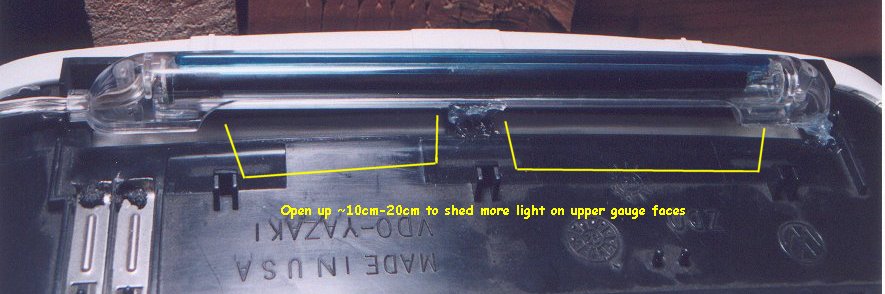 After seeing that there was light drop-off at the top of the gauges (and two LCD filters was just too much) I had to remove my cluster and open up the light openings. Illustrated is roughly what I did. The material you remove will not be visible -- you won't see the opening -- and it will allow more UV light to reach higher up on the large gauge faces, thus illuminating the needles more when they reach the 12 o'clock position. Don't remove too much material or you will see the openings. If unsure, leave the openings alone and you will see what I mean when things are glowing at night. Then you can remove the gauge cluster and open it up more since removing the cluster is quite easy.