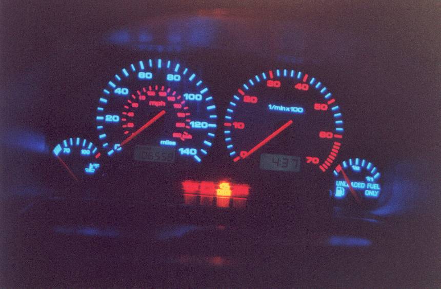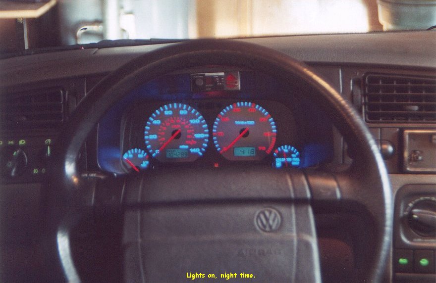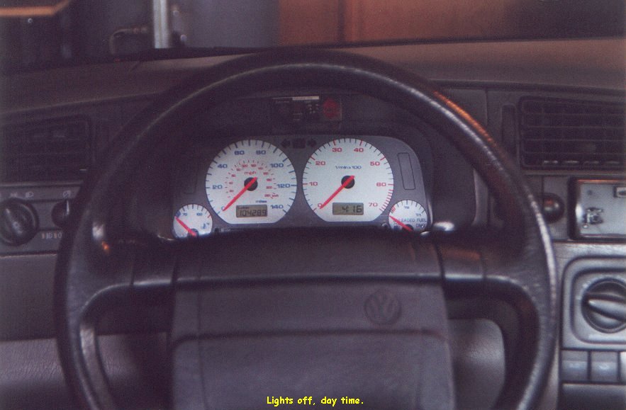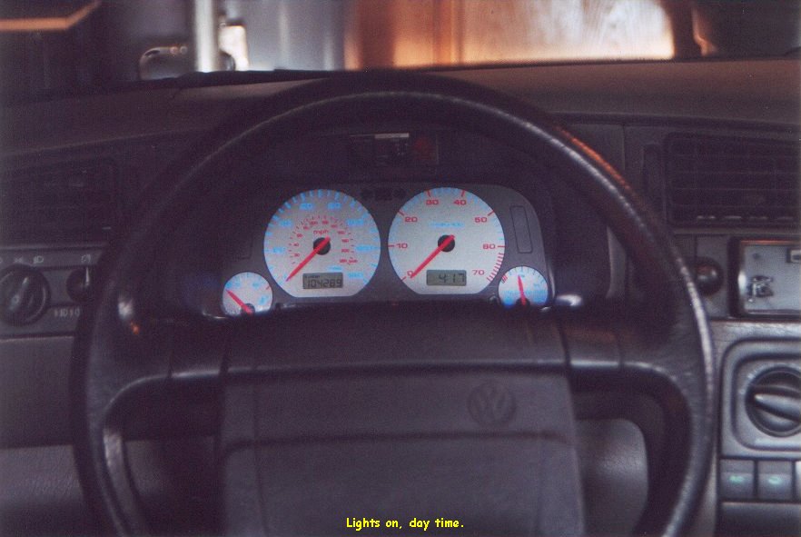 These pictures were taken in my garage during the day. Below is what the gauge cluster looks like in muted daylight: