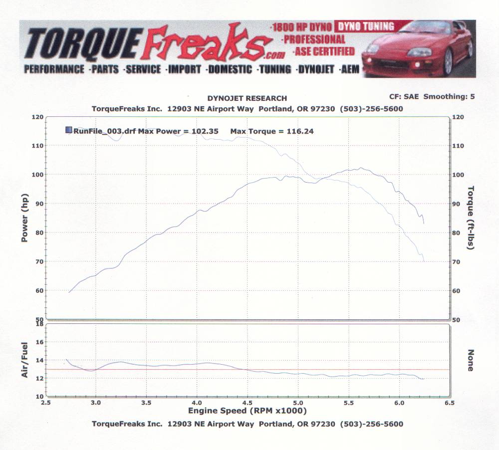 102hp...much better! My air:fuel ratio is quite nice, rpm band smooth and plenty of low-down torque, great for getting around those damn tiny females slowly driving their over-sized SUVs and "mini-vans" in city and rural traffic! The car has power you can feel, the kind that pushes you back into your seat with gusto!