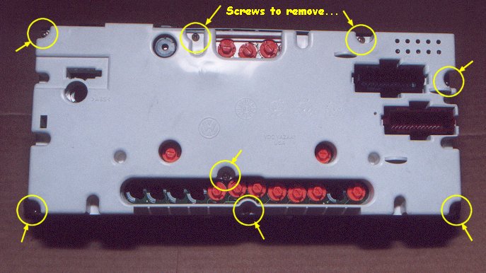 Place the gauge cluster face-down on a clean surface. Remove the eight brass-colored screws.
