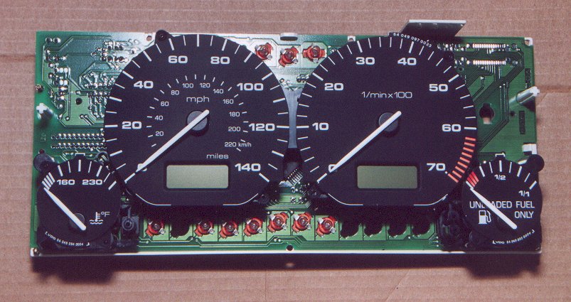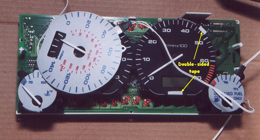 Carefully remove the back of the cluster, move the front clear plastic facing away and turn over the rear so the gauge faces can be seen.