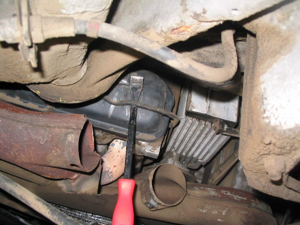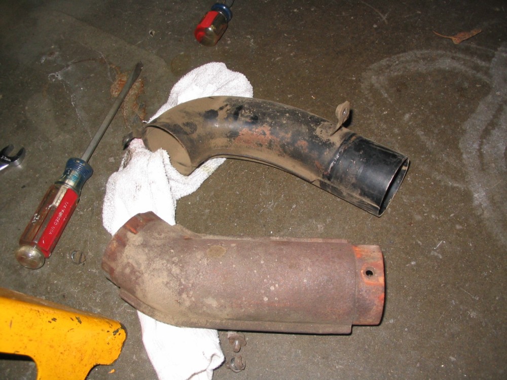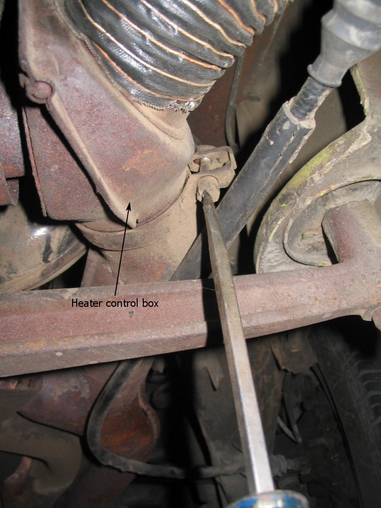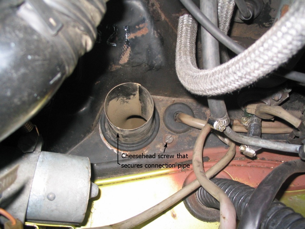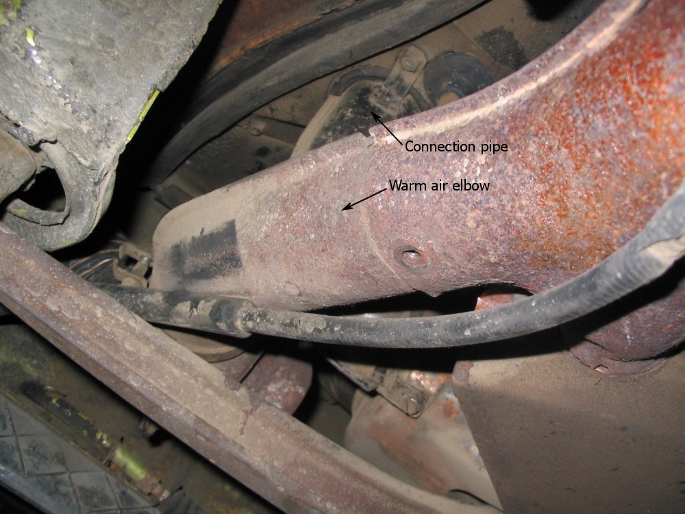 Get underneath the car. Remove the cheesehead screws from the top and bottom of the warm air elbow. As a personal note, I would recommend replacing the top cheesehead screw with a stainless steel bolt and washer (M6 x 1.00) as it will make removal next time much easier with a 10mm wrench