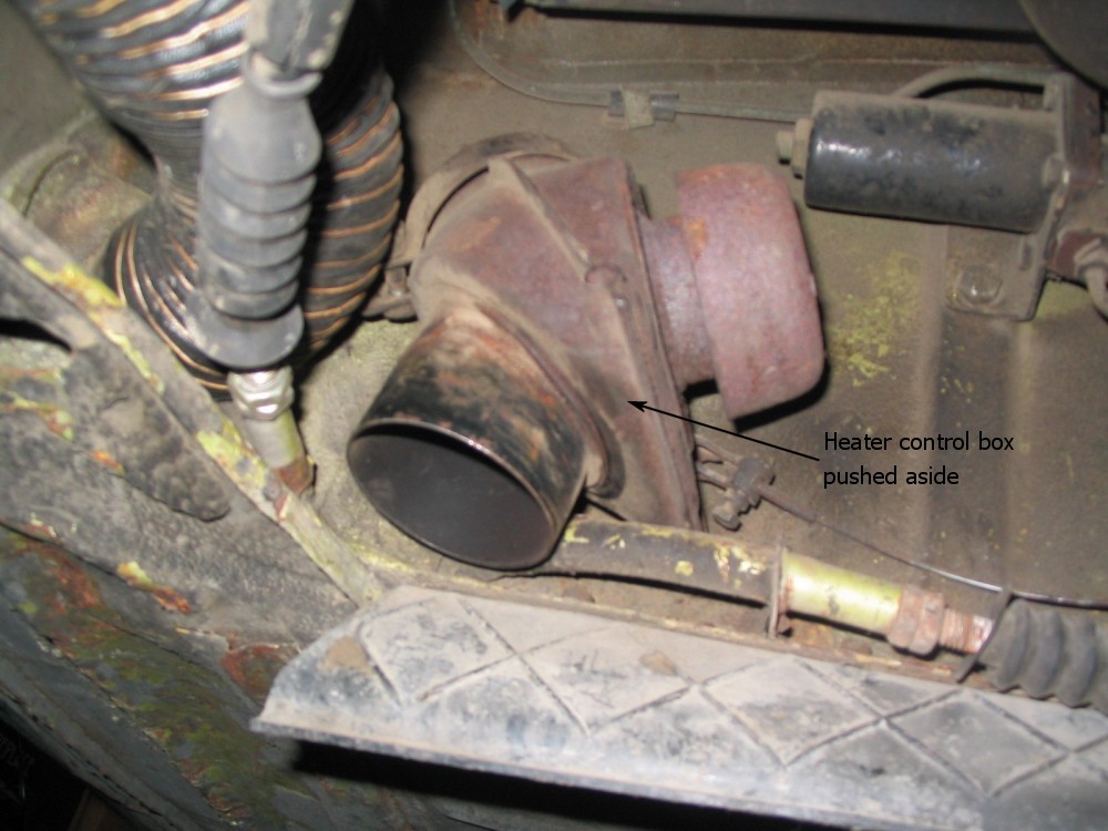 Remove the flexible hose from the heater control box and push aside. Remove the warm air elbow and tuck the heater control box against the firewall.