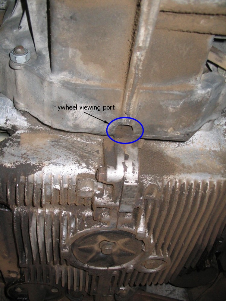 Look for the small opening where the transaxle meets the engine. While the engine is still on #1 TDC, make a mark on the flywheel that's visible in the hole. My flywheel already had a couple small dimples punched into the flywheel, like someone used a carbide pointer and tapped it into the flywheel. This is your indication that the #1 or #3 cylinder is in the TDC position, depending where your rotor is pointing (at #1 or #3 firing position). Remember, the distributor rotor will turn 90° for every 180° the flywheel turns.