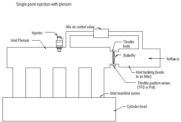 Single point injection systems use a single fuel injector that injects into the inlet manifold or plenum; the fuel injected is drawn in to the cylinders by airflow in a similar way to a carburettor. Because of the variations in length and orientation of the various branches in the inlet manifold or plenum, the fuel distribution characteristics are not ideal so economy / emissions and throttle response suffer as a result.