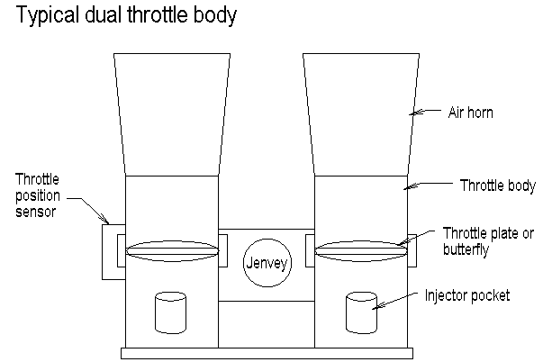 A throttle body is no more than a tube or barrel that regulates air into the engines inlet manifold or inlet port. It is normally of tubular construction with a butterfly or throttle plate that opens and closes to regulate the airstream. Some throttle bodies have provision for mounting of fuel injectors others do not; it depends entirely on the application. The type of throttle body that feeds a plenum is normally a single body and has no provision for an injector pocket. Throttle bodies are essentially like carburettors but without the float chamber or jets/venturis, their configuration is often similar to carburettor configurations in that they are generally available as individual throttle bodies or twinned as dual bodies.