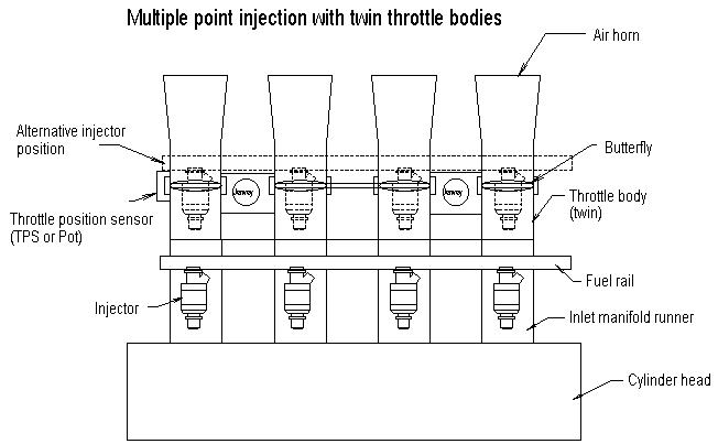 There are two basic types of induction systems used with injection, plenum based systems with a single throttle body and multiple throttle body systems that do not use a plenum but supply the inlet ports directly.