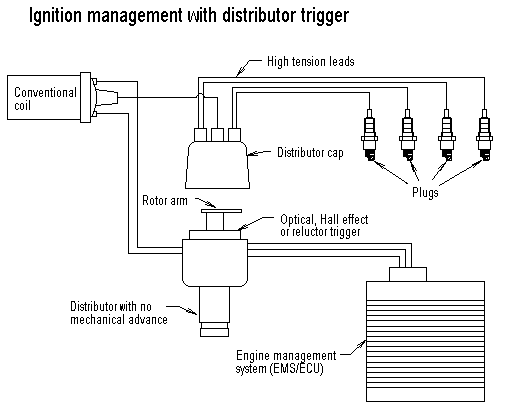 An EMS can control the ignition with very few moving parts; all it needs is a trigger and a load sensor of some kind. The EMS knows the load on the engine as well as the engine RPM. Since the ignition timing is mapped for each engine speed and load the timing is at the optimum for the engine for each load condition including part throttle. This gives the best possible performance and economy whatever the throttle position. In addition since the triggering systems invariably have no physical wear points the timing stays set correctly more or less indefinitely and is maintenance free. There are other spin-offs such as rev-limiting, shift light, accurate tacho driving and telltale as well as the certainty that the timing is never likely to 'go off'.