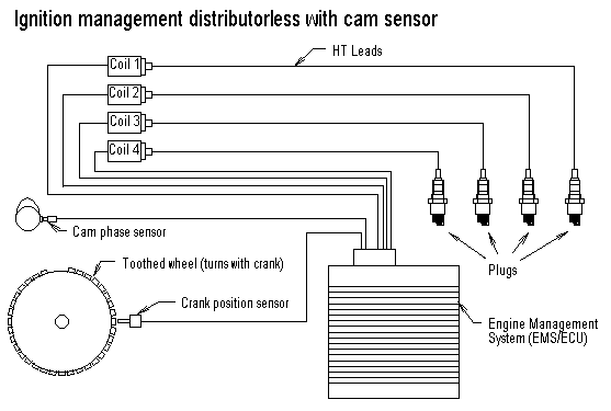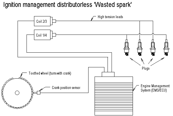 This type of system does away with the distributor altogether, it uses the crank sensor to indicate where TDC is and then uses the signals from the sensor and the map information to determine when to fire the spark (twice per revolution). It groups the signals to two separate coils that provide the spark to pairs of cylinders that are at the same relative crank position. One of these cylinders will be on the firing stroke and will ignite, the other will be in the scavenge stroke and therefore the spark will be 'wasted', this is why these systems are known generically as 'wasted spark' systems. In practice the coils are usually double ended with a high-tension lead running from either end to each of the cylinders in the pairing.