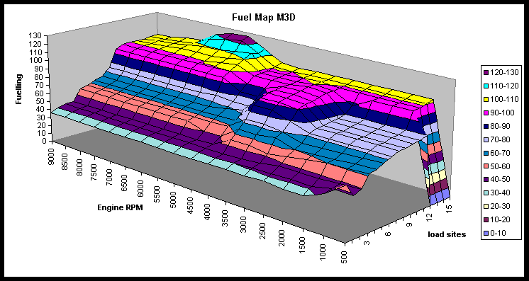 When the engine has been mapped it is quite interesting to examine the maps. Normally the map information (after a little massaging) can be imported into Excel or similar and plotted as a surface contour. Some EMS systems (such as the Emerald M3D and GEMS system) have a graphical display built in to allow the maps to be viewed as a surface contour or wire-frame graph. Visualising the maps in this way gives a much better and clearer picture of the engines fuel requirements and helps to iron out any 'glitches' in the maps.